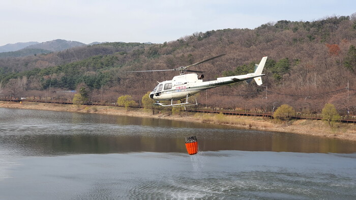 사진/ 산불 진화용 임차헬기가 광교저수지 일원을 비행하는 모습(사진제공=수원시)