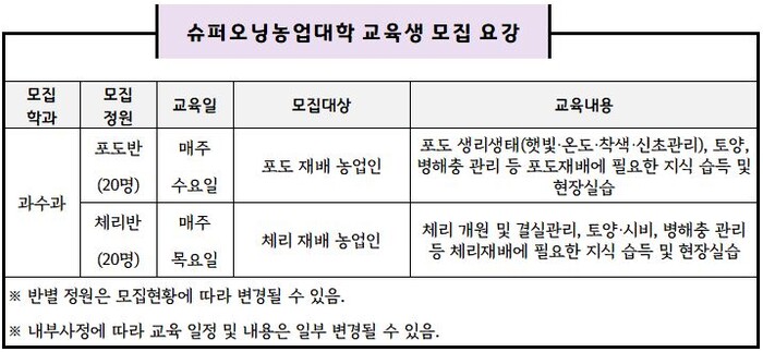 올해 개설학과는 과수과로 포도반·체리반으로 나누어 반별 20명씩 총 40명을 모집한다. 모집 대상은 주민등록상 평택시에 주소를 두고 포도와 체리를 재배하는 농업인이다. 모집 기간은 2월 3일까지며, 서류전형과 면접(2월 9일)을 통해 최종 선발(2월 15일)한 후 개별 문자 통보할 예정이다.