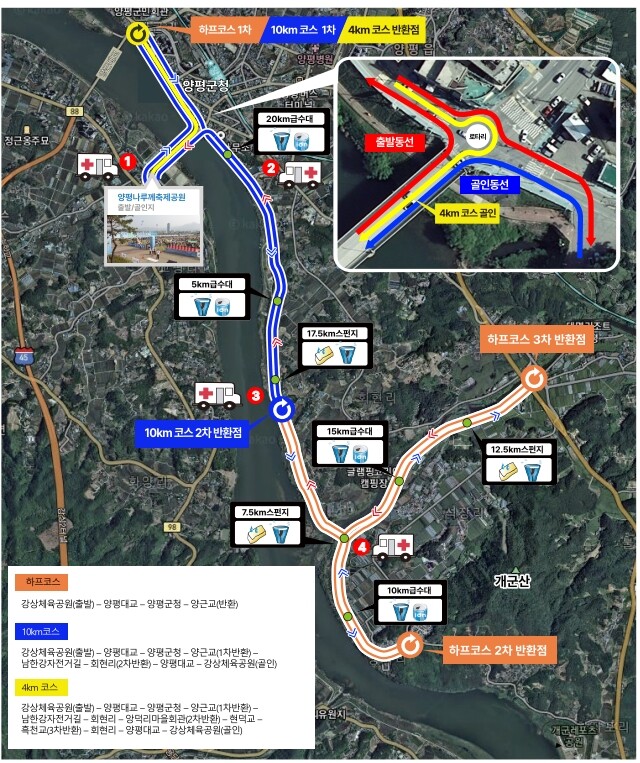 군 관계자는 “원활한 대회진행을 위해 당일 08시 50분부터 12시까지 주로(主路)인 양평대교(舊 대교)부터 도로통제가 이뤄질 예정“이라며, ”주민들에게 최대한 피해가 가지 않도록 대회 종료시 신속한 통제 해제와 추후 대회는 새 코스를 확보해 통제구역을 최소화할 수 있도록 노력하겠다”고 말했다.