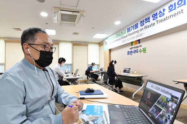 수원시가 국제자매결연을 추진하고 있는 미국 피닉스시와 5일 온라인 플랫폼을 활용해 영상회의를 열고, 폐기물 정책을 교류했다.