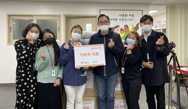 해피기버는 지난 25일 오전 10시 장안구 수원시다문화가족지원센터를 방문해 경제적으로 어려움을 겪는 다문화가족·외국인주민 자녀들을 위해 써달라며 기저귀 100상자를 전달했다.
