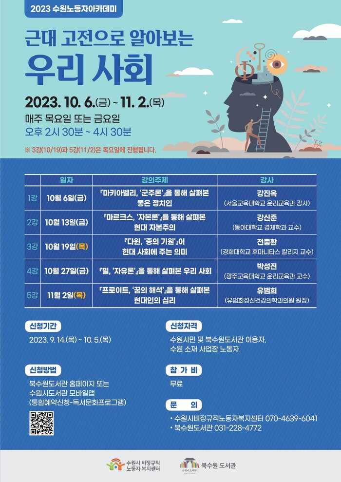 수원시비정규직노동자복지센터가 2023 하반기 수원노동자아카데미 ‘근대 고전으로 알아보는 우리 사회’를 운영한다.