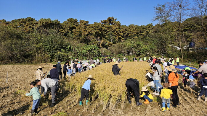 수원시 칠보 생태환경체험교육관은 지난 28일 호매실동 친환경 논 체험장(개구리논)에서 시민과 함께하는 벼베기 행사를 열었다.