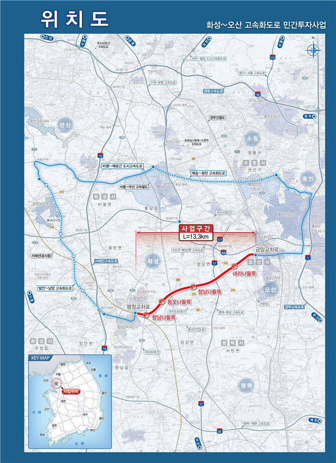 정명근 화성특례시장은 “화성~오산 고속화도로는 화성특례시의 동서축 주간선도로망으로서 기존 국지도와 지방도의 과밀 교통 수요를 효율적으로 분산시키고 교통 흐름을 크게 개선할 것”이라며, “일반구 체제 출범과 더불어 관내 30분 이동 시대 실현을 위해 사업을 차질 없이 추진하겠다”고 강조했다.