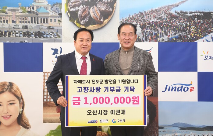 이번 기부는 고향사랑 기부제 시행에 발맞춰 자매도시인 오산시와 진도군이 서로 상생 발전하고 협력하는 영원한 우정을 약속하기 위해 오산시의 제안으로 성사됐다.