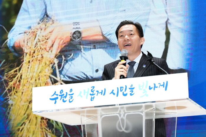 사진/이재준 수원특례시장이 16일 교육에 앞서 인사말을 하고 있다.(사진제공=수원시)