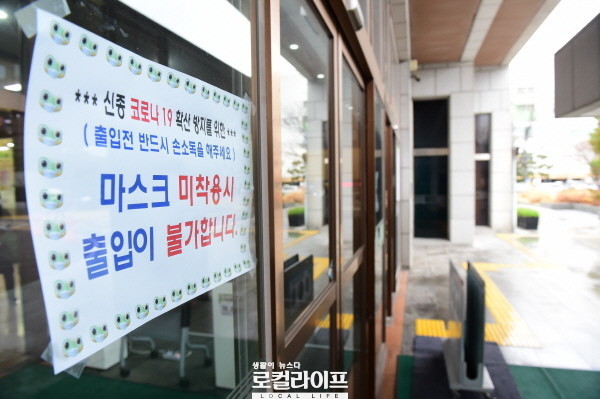 | ▲ 수원시는 코로나19 극복을 우한 사회적 거리두기 강화를 위해 ‘민·관 영상회의 시스템’을 구축했다. 사진은 코로나19 확산 방지를 위해 마스크 착용을 독려하는 수원시청사 모습. (사진제공=수원시) |