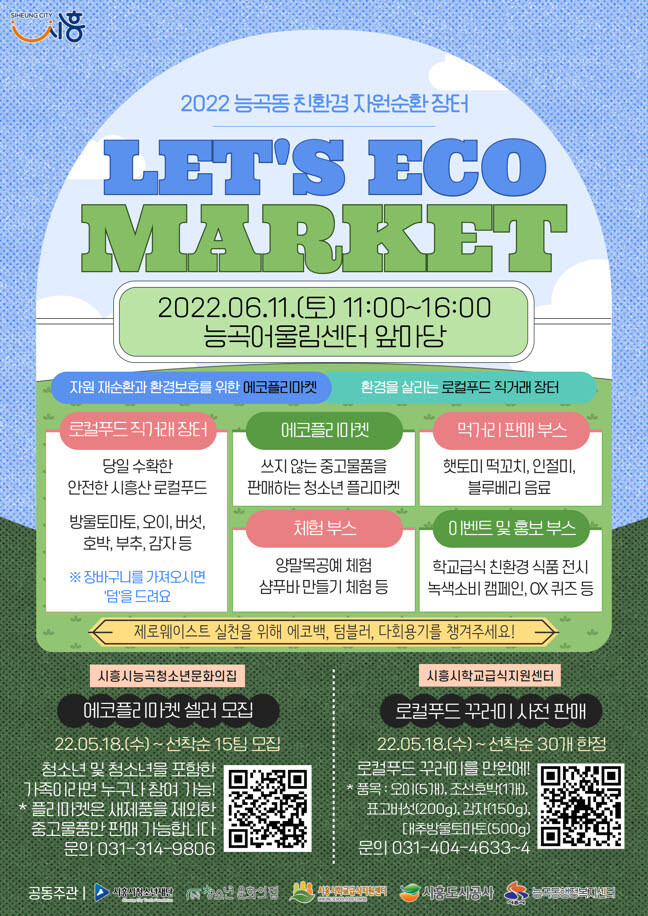 (재)시흥시청소년재단(대표이사 이덕희) 시흥시능곡청소년문화의집(관장 박종희)은 지역사회 친환경 녹색문화를 확산하고 탄소중립을 실천하고자, 2022년 능곡동 자원순환 장터 ‘LET’S ECO MARKET(렛츠에코마켓)’을 개최한다.