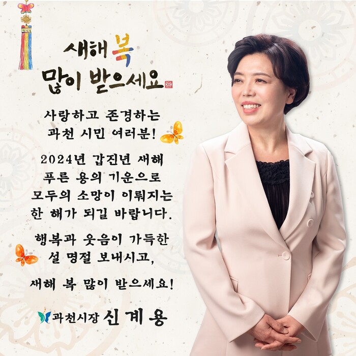 [과천=로컬라이프] 임윤수 기자 = 신계용 과천시장은 10일, 설날을 맞아 자신의 페이스북을 통해 사랑하고 존경하는 과천시민 여러분 2024년 갑진년 새해 푸른 용의 기운으로 모두의 소망이 이뤄지는 한 해가 되길 바란다고 전했다.