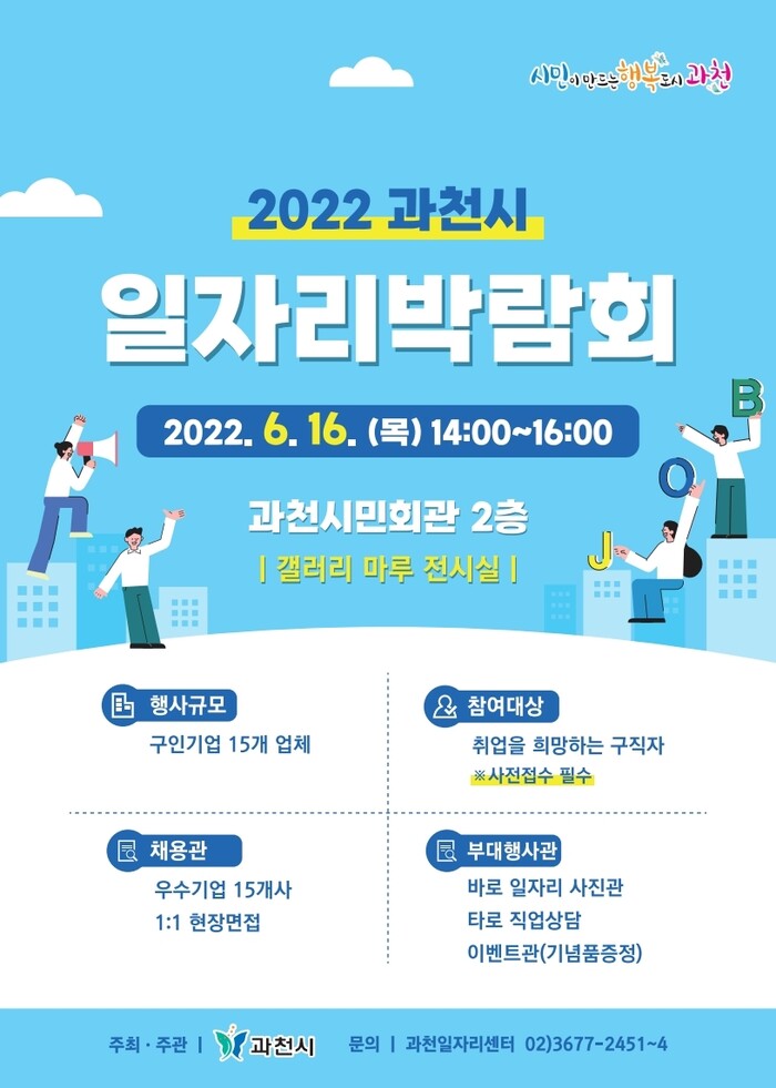 과천시는 코로나19 장기화로 얼어붙은 취업시장에 활기를 불어넣고, 취업난 극복을 위해 오는 16일 시민회관 2층 갤러리마루에서 오후 2시부터 ‘2022 과천시 일자리 박람회’를 개최한다.