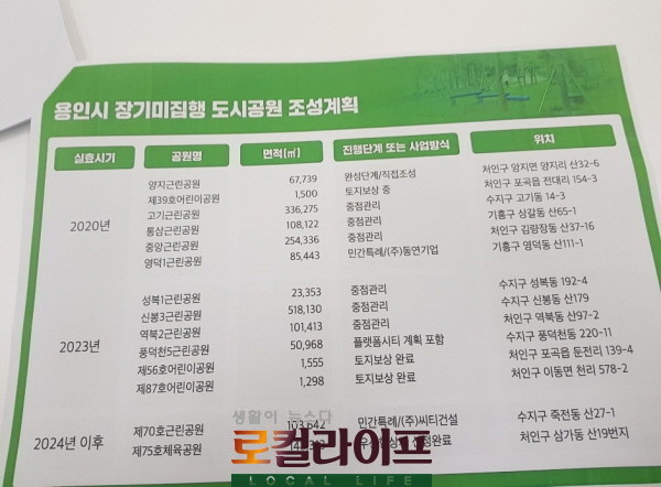 [용인=로컬라이프] 임현상 기자 = 용인시는 ‘공원일몰제’ 시행을 앞두고 오는 2023년까지 실효 시기가 돌아오는 12개 장기미집행 도시공원을 하나도 실효시키지 않고 모두 조성키로 했다.