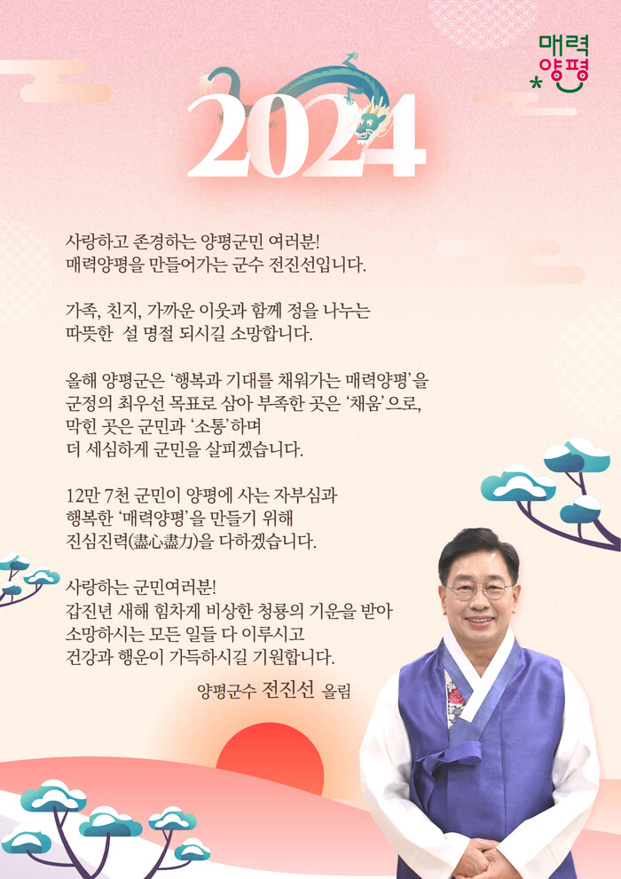 [양평=로컬라이프] 임윤수 기자 = 전진선 양평군수는 10일, 설 명절을 맞아 가족, 친지, 가까운 이웃과 함께 정을 나누는 따뜻한 명절 되시길 소망한다고 전했다.
