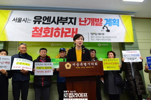 권수정 서울시의원(정의당) 및 설혜영 용산구의원(정의당)과 인근 지역 주민 등은 28일, 서울시의회에서 기자회견을 갖고 “서울시는 유엔사 부지의 난개발 계획을 승인해서는 안된다”며 “유엔사 부지의 특혜성 난개발 강행은 중단돼야 한다”고 주장했다.