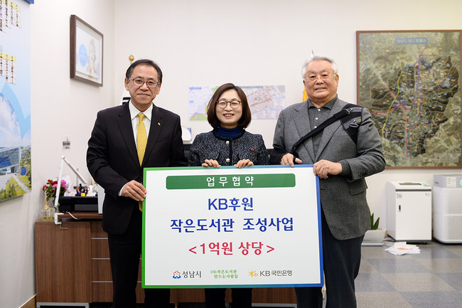 성남시는 12월 13일 오후 2시 시장 집무실에서 은수미 성남시장과 양재영 KB국민은행 경기남지역 영업그룹 대표, 김수연 ㈔작은도서관 만드는 사람들 대표 등이 참석한 가운데 ‘중원청소년수련관 작은도서관 리모델링에 관한 업무 협약’을 했다. 협약에 따라 KB국민은행은 사업비 1억원을 후원한다.