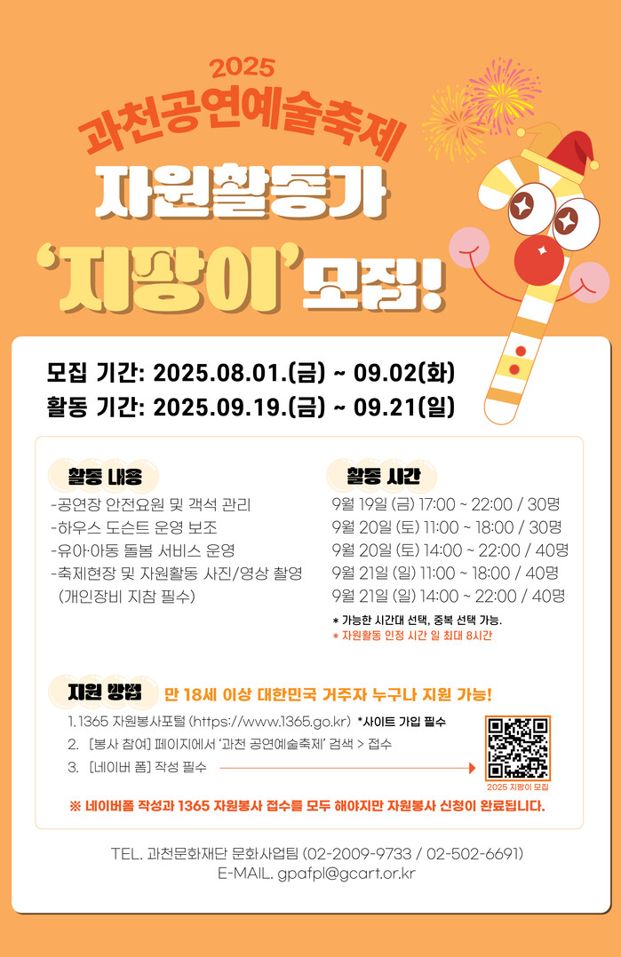 과천시는 ‘2025 과천공연예술축제’의 원활한 운영과 시민 참여 확대를 위해 자원활동가 ‘지팡이(G-PANG E)’를 오는 8월 1일부터 9월 2일까지 모집한다.