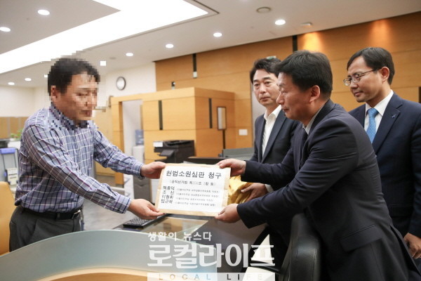 | ▲ ‘공직선거법 제250조(허위사실공표죄) 제1항’에 대한 헌법소원심판 청구서를 헌법재판소에 접수하고 있다. (사진=로컬라이프) |