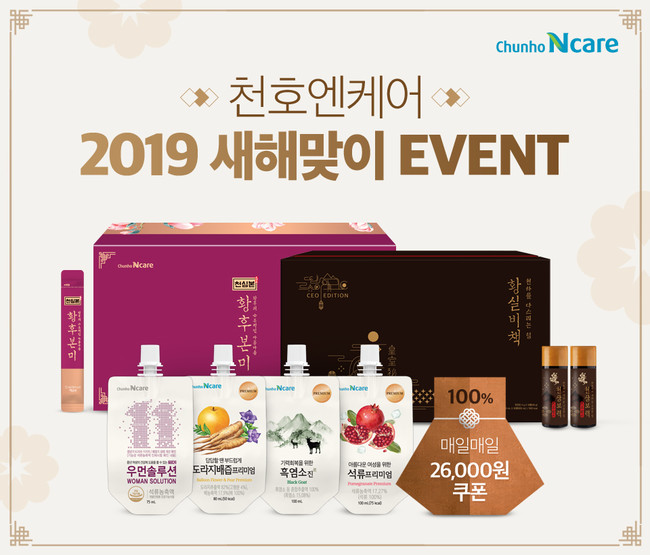 천호엔케어 관계자는 “2019년 새해를 맞아 한 해를 건강하게 시작할 수 있도록 천호엔케어의 대표 제품들을 합리적인 가격에 만나볼 수 있는 이벤트를 마련했다"며 "건강즙, 환, 건강기능식품 등 다양한 라인업으로 구성한 만큼 천호엔케어의 건강식품과 함께 보다 활기차게 한 해를 시작하길 바란다"고 밝혔다.
