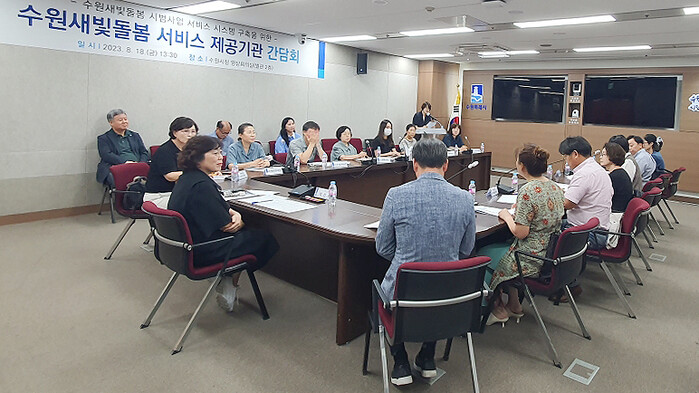 수원시는 18일 오후 1시30분부터 수원시청 영상회의실에서 ‘수원새빛돌봄 시범사업 서비스 시스템 구축을 위한 제공기간 간담회’를 개최했다.