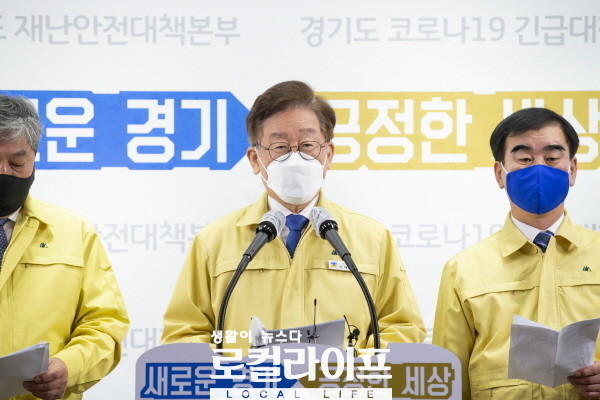 이재명 경기도지사는 24일, 경기도청 브리핑룸에서 온라인 기자회견을 갖고 “4월부터 도민 1인당 10만 원씩, 4인 기준 가구당 40만 원씩을 재난기본소득으로 지급한다”고 밝혔다.