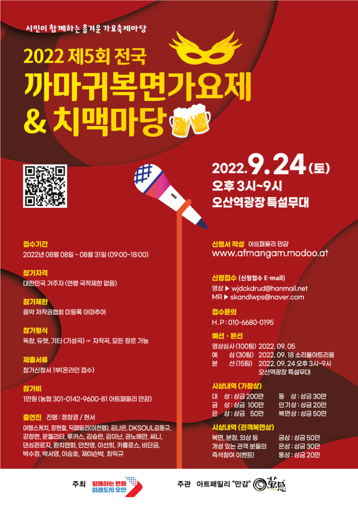 오산시(시장 이권재)는 다음달 24일 제5회 전국 까마귀 복면 가요제를 오산역광장 특설무대에서 4년만에 야외행사로 진행한다고 11일 밝혔다.