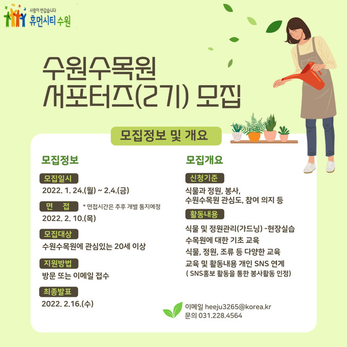 신청 서식 등 자세한 내용은 수원시 홈페이지(https://www.suwon.go.kr) ‘수원소식→공고/고시/입법예고’에 게시된 ‘수원수목원 서포터즈(2기) 모집’ 공고문에서 볼 수 있다.