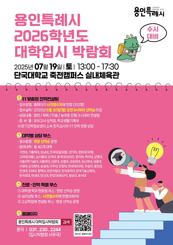 용인특례시(시장 이상일)는 7월 19일 오후 1시부터 5시 30분까지 단국대학교 죽전캠퍼스 실내체육관에서 ‘2026학년도 수시대비 대학입시박람회’를 개최한다고 25일 밝혔다.