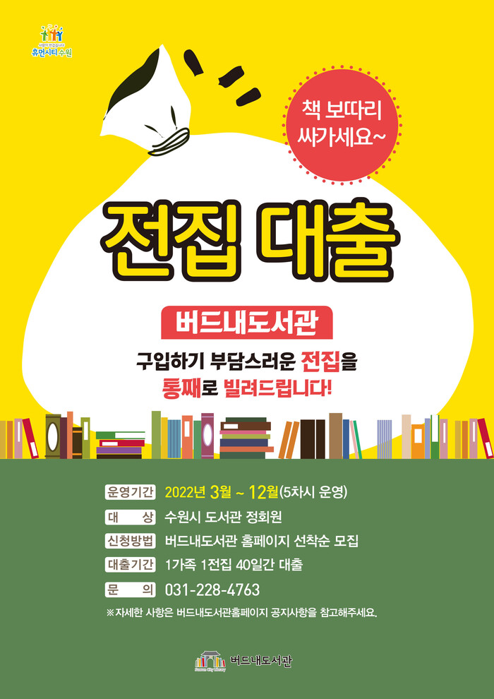 대출할 수 있는 전집은 ▲비룡소 그림동화(비룡소, 60권) ▲수상작 컬렉션(시공 주니어·배틀북 등, 60권) ▲Why 한국사·세계사(예림당, 65권) ▲내일은 실험왕(아이세움, 50권) ▲용선생 시끌벅적 과학교실·용선생이 간다 세계 문학 여행(사회평론, 43권) ▲Step into reading Level 1+2(스텝 인투 리딩 레벨 1+2, Random House, 70권) ▲Ready readers+Sunshine Readers Series Level 1 (레디 리더스+선샤인 리더스 시리즈 레벨 1, Rourke Educational Media·Compass 등, 60권) 등이다.버드내도서관 홈페이지(https://www.suwonlib.go.kr/bdn/index.asp)의 ‘통합예약’→‘독서문화프로그램’ 페이지에서 ‘전집 신청’이나 수원시도서관 앱을 이용해 3월 2일부터 5일까지 신청할 수 있다. 선착순이다.