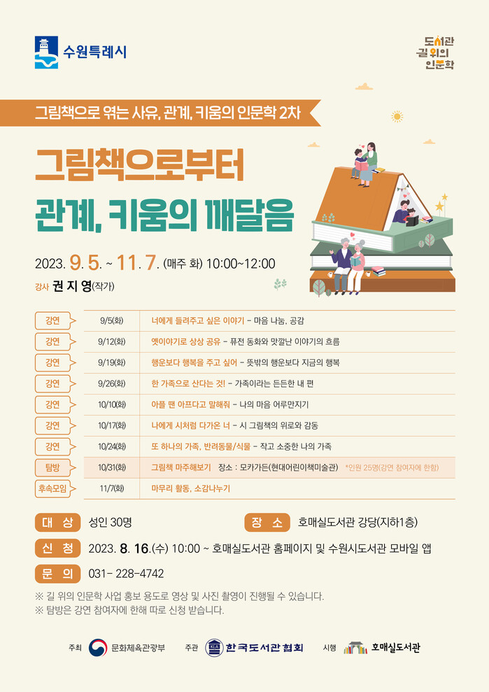 수원시 호매실도서관이 2023년 길 위의 인문학 ‘그림책으로부터 관계, 키움의 깨달음’ 강좌에 참여할 시민 30명을 모집한다.
