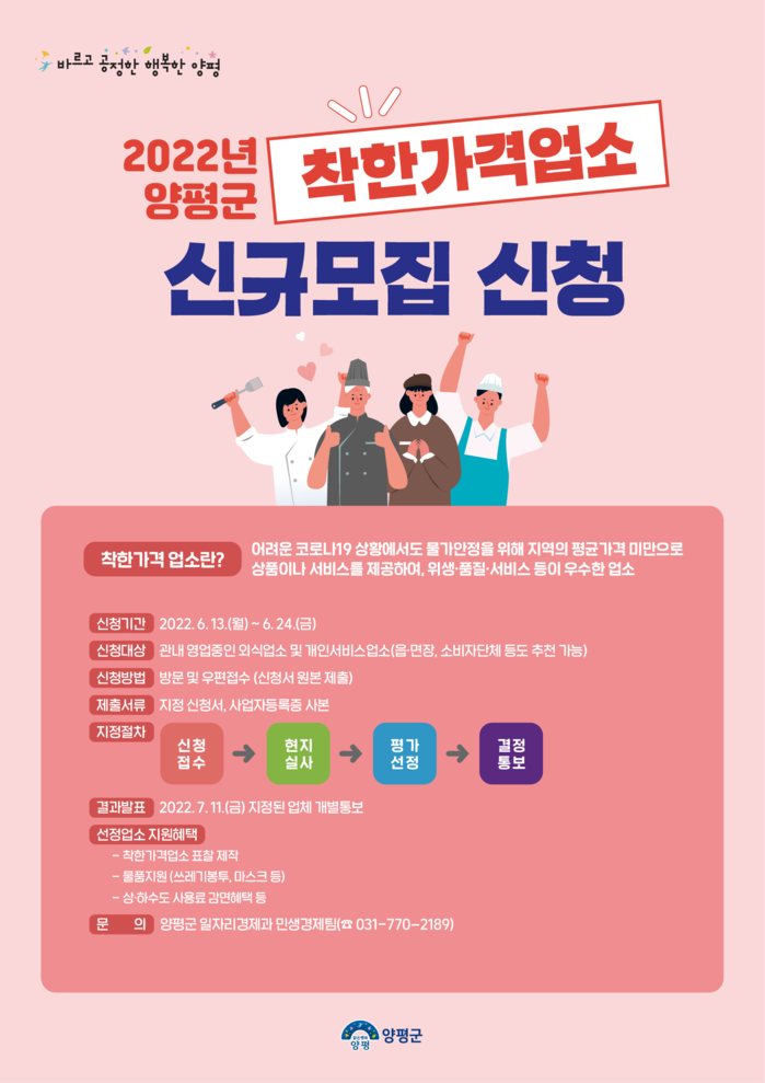양평군(군수 정동균)은 6월 13일부터 24일까지 2주 간 착한가격업소를 신규모집한다.