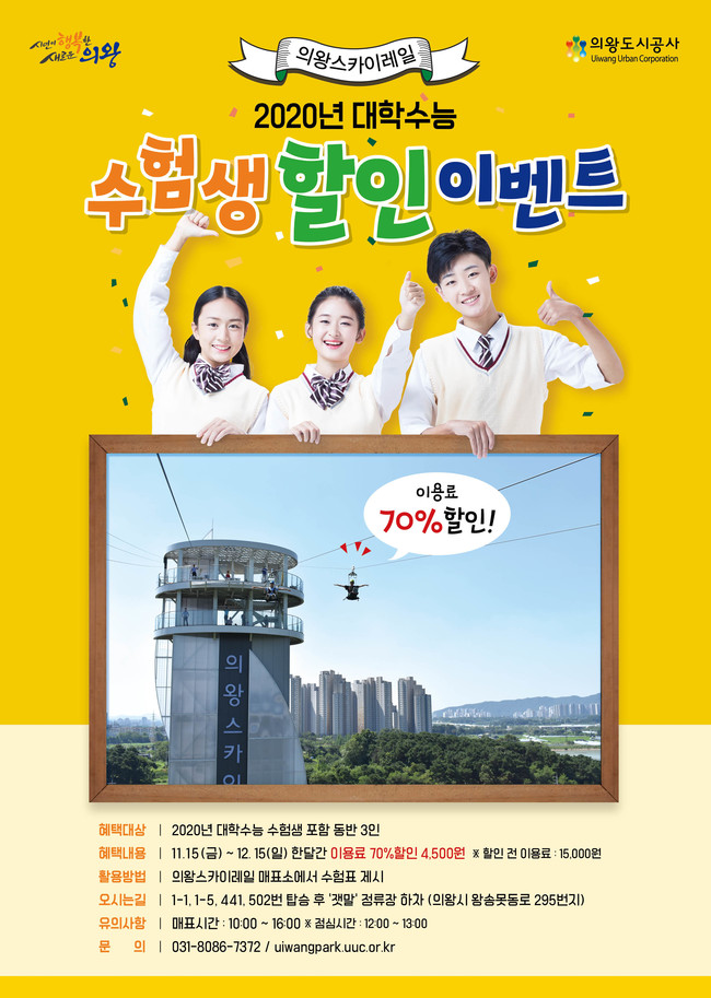[의왕=로컬라이프] 송준형 기자 = 의왕도시공사(사장 최욱)는 2020학년도 대학수학능력시험을 보는 모든 수험생들을 대상으로 의왕스카이레일 특별 할인 이벤트를 확대 운영한다.