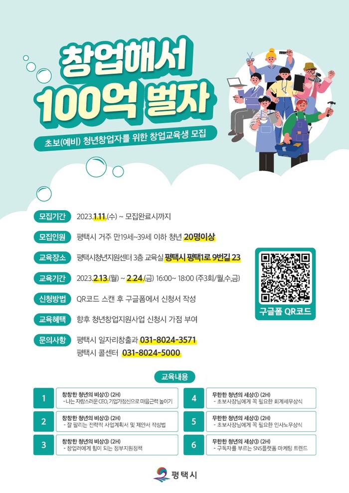 올해 처음 시작되는 이번 창업 교육은 만19~39세 이하 관내 거주 청년들을 대상으로 2월 13일부터 24일까지 주 3회(월, 수, 금), 오후 4~6시에 실시하며, 장소는 평택시 청년지원센터이다.