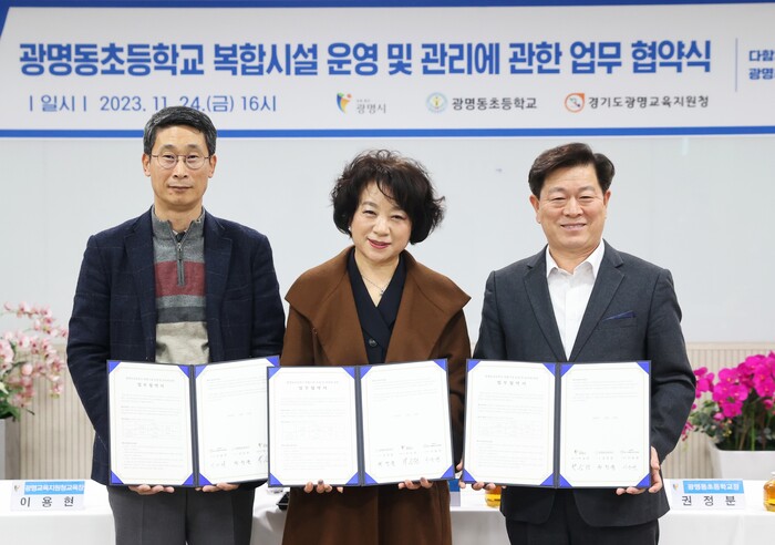 광명시(시장 박승원)는 24일 오후 평생학습원에서 광명동초등학교, 광명교육지원청과 ‘광명동초등학교 복합시설 운영 및 관리에 관한 업무 협약’을 체결하고, 시설의 효율적 운영을 위해 협력하기로 했다.