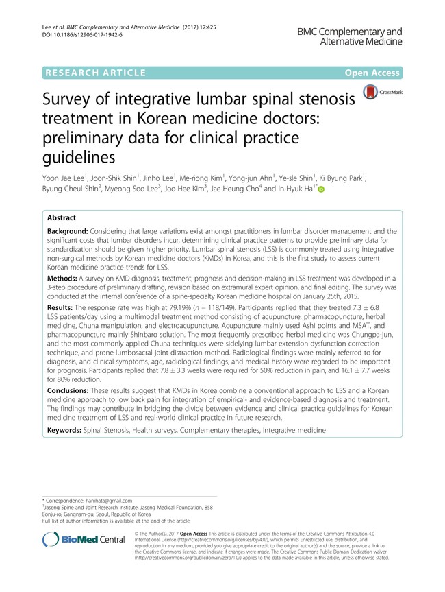 자생한방병원 척추관절연구소(소장 하인혁) 이윤재 연구팀은 한방통합치료를 실시하고 있는 한의사 117명을 대상으로 '요추 척추관협착증 치료 설문 연구'를 실시했다고 밝혔다. 해당 논문은 SCI(E)급 국제저널 "BMC 보완대체의학(BMC Complementary and Alternative Medicine, IF=2.288)" 최신호에 게재됐다.