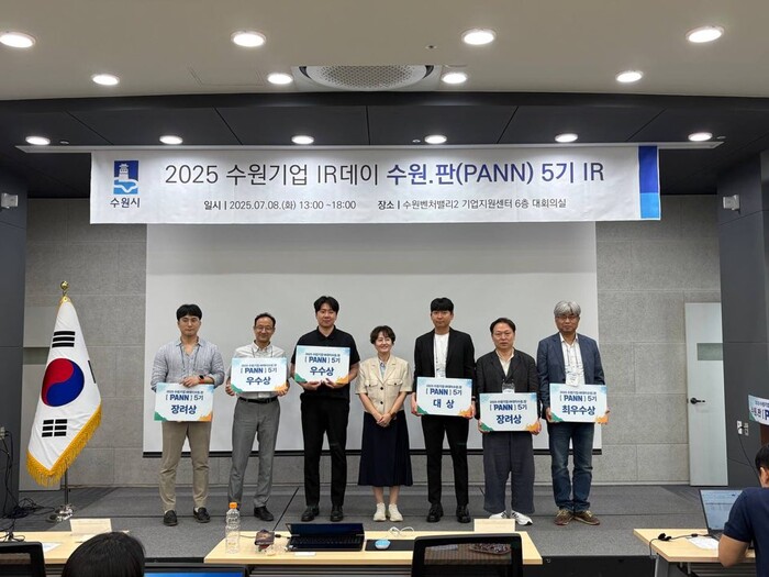 사진/ ‘수원기업 IR데이 수원.판(PANN) 5기’ 수상자들이 기념사진을 촬영하고 있다.(사진제공=수원시)