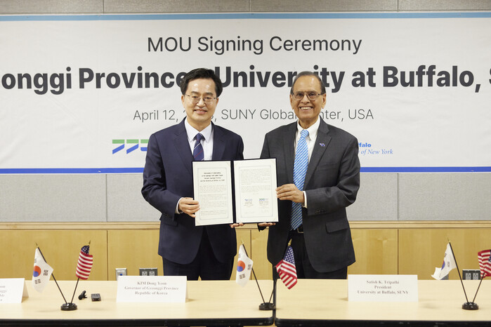 김동연 경기도지사는 현지 시각 12일 오전 미국 뉴욕에 위치한 뉴욕주립대(SUNY) 글로벌센터에서 사티쉬 K. 트리파티(Satish K. Tripathi) 뉴욕주립대버팔로 총장과 이런 내용을 담은 ‘경기도 – 뉴욕주립대버팔로 간 경기청년사다리프로그램 협약서’에 서명했다.