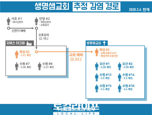 그리고 4일 아침 화성시 반월동에 거주하는 42세 여성이 ‘수원시 16번째 확진자’로 판정받았다. 이 확진자 역시 ‘생명샘교회’ 신도로 2월 23일과 26일 각각 ‘수원시 13번째 확진자’와 교회에서 접촉한 것으로 추정되고 있다.