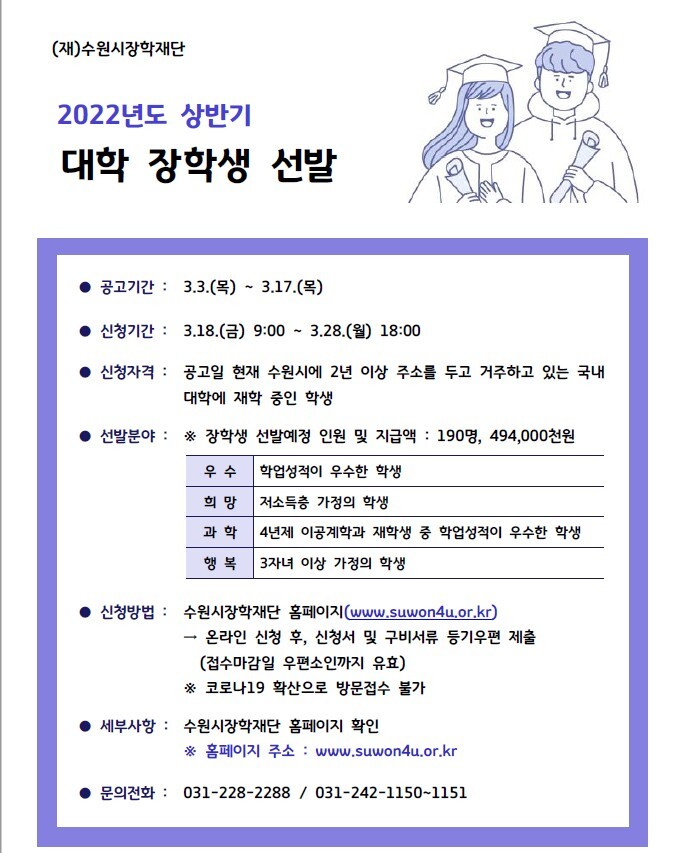 수원시장학재단이 2022년도 상반기 대학 장학생 190명을 선발한다. 장학금 총액은 4억 9400만 원이다.