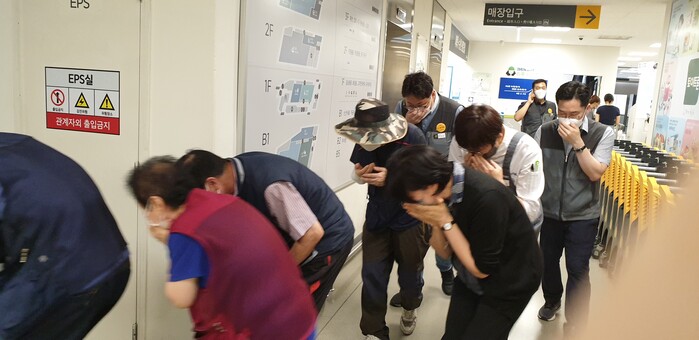 훈련은 지난 23일 대형마트와 병원, 미용실 등이 있는 지상 10층 규모의 다중이용시설 건물(별양상가3로 11)의 고층에서 방화 테러가 발생한 상황을 가정한 가운데 이용객 대피 및 부상자 이송, 화재 진압과 방화범 체포의 과정으로 진행됐다.