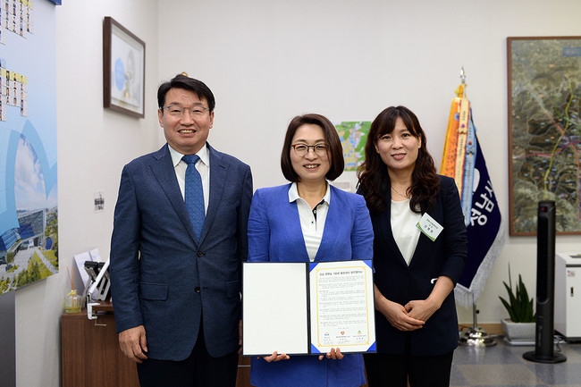 <사진/ 성남시 생명숲 100세 힐링센터 설치 운영에 관한 업무 협약 후 조경연 생명보험사회공헌재단 상임이사(왼), 은수미 성남시장(가운데), 신명희 중원노인종합복지관장(오른) 기념사진>