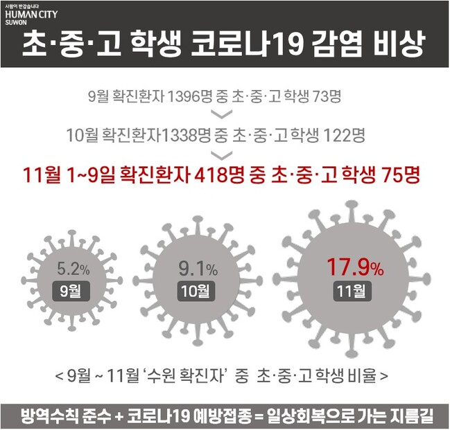 9월 수원시 코로나19 확진자 1396명 중 초·중·고등학생은 73명(5.2%)이었는데, 10월 확진자 1338명 중 초·중·고등학생은 122명(9.1%)으로 증가했다.