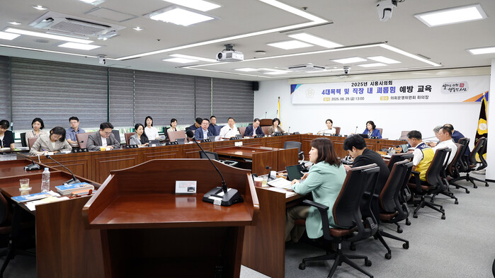 경기 시흥시의회(의장 오인열)가 8월 29일 의회운영위원회 회의장에서 시의원 및 의회사무국 직원들을 대상으로 4대 폭력 예방 및 직장 내 괴롭힘 예방 교육을 진행했다.