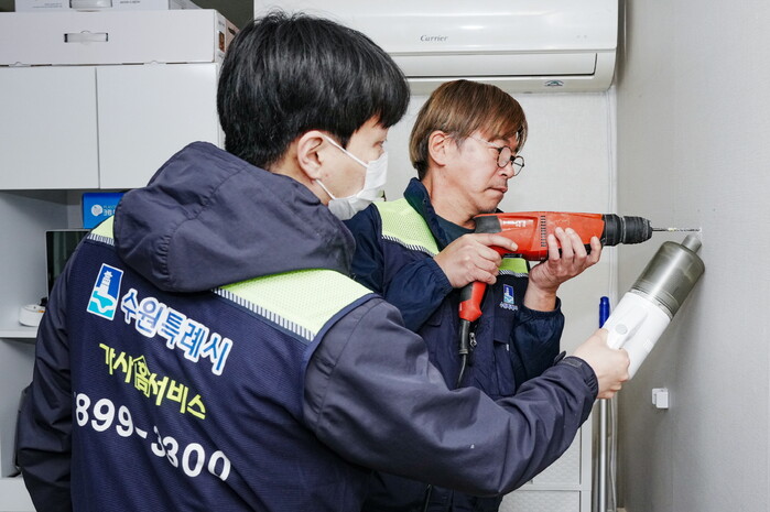 사진/ 가사홈서비스 기술자가 선반을 설치하고 있다.(사진제공=수원시)