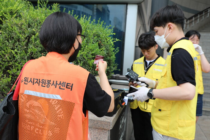 수원시자원봉사센터와 직장인, 대학생으로 구성된 ‘청년팀플 수원청년봉사단’이 화장실 불법 촬영기기 점검과 예방 활동에 나섰다.