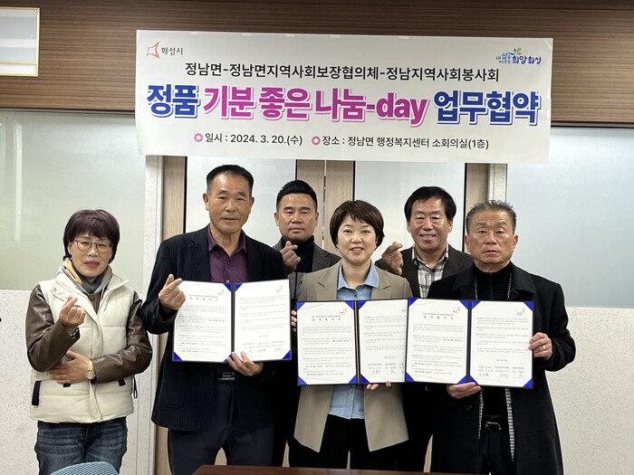 화성시 정남면(면장 김조향)이 복지 사각지대 해소와 나눔문화 확산을 위해 20일 ‘정품 기분좋은 나눔데이 업무협약’을 체결했다.