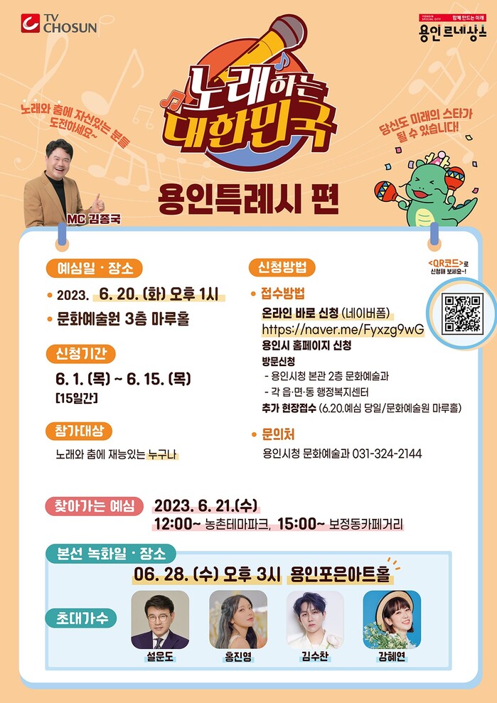 참가신청은 용인특례시청 문화예술과와 각 읍·면·동 행정복지센터에서 할 수 있으며, 용인문화예술원 마루홀에서 6월 20일 오후 1시에 열리는 예심 현장에서도 신청 가능하다.