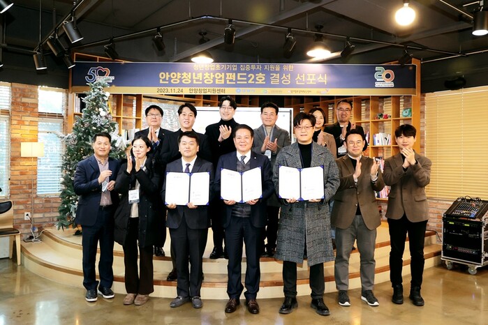 시는 24일 오후 동안구 관양동의 안양창업지원센터 3층 동안청년오피스에서 안양산업진흥원과 함께 ‘안양청년창업펀드 2호 결성 선포식’을 개최하고, 시와 펀드운용사 간 업무협약(MOU)을 체결했다.