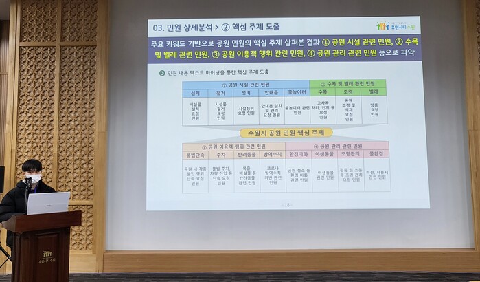 이날 발표한 분석 결과는 공공빅데이터 청년 인턴 분석과제인 ‘수원시 공원민원 분석’과 ‘지역 상권 분석’, 수원시 빅데이터 플랫폼을 활용한 ‘인구 및 출생아 예측’, 과학기술정보통신부 스마트 치안 플랫폼 구축 사업으로 진행한 ‘수원시 스마트 치안 분석’등 4개다.