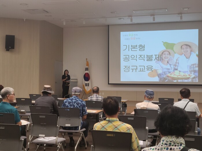 수원시는 ‘기본형 공익직불제’ 정규교육 미이수자를 대상으로 25일 수원시농수산물도매시장 대회의실에서 대면교육을 열었다.