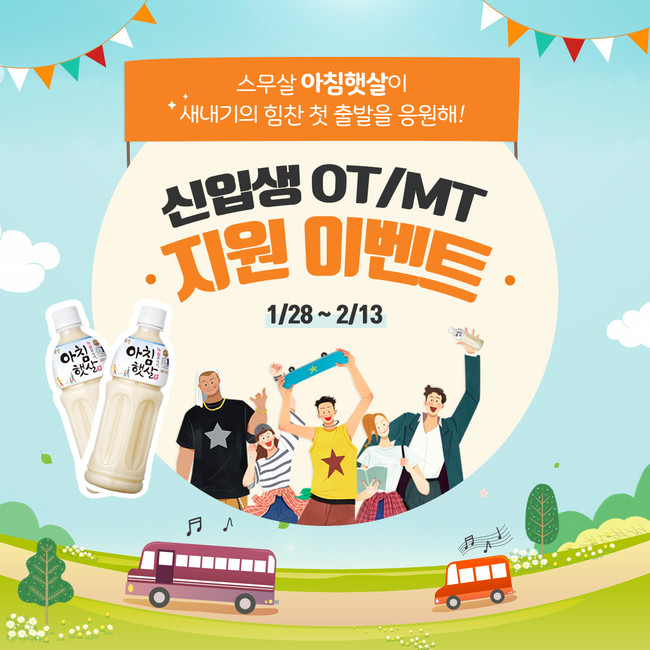 웅진식품이 아침햇살 출시 20주년을 기념해 대학 신입생들을 대상으로 ‘신입생 OT/MT 지원 이벤트’를 실시한다고 밝혔다. 이번 행사는 ‘스무살 아침햇살이 바쁜 청춘을 응원합니다.’ 캠페인의 일환으로, 대학 새내기들의 첫 출발을 응원한다는 취지로 기획됐다.