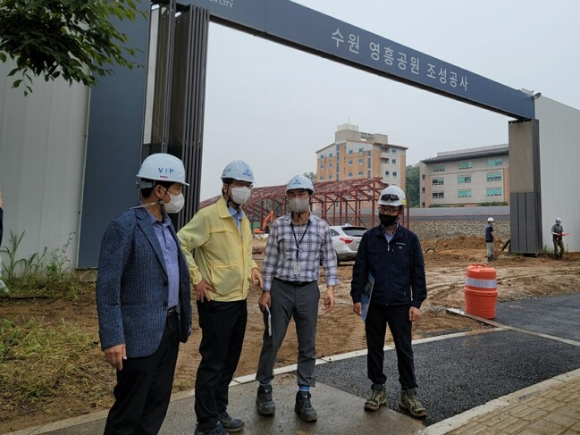 사진/8일 오후 유문종 수원시 제2부시장이 영통구에 위치한 영흥공원 조성공사 현장을 점검하고 있다.(사진제공=수원시)